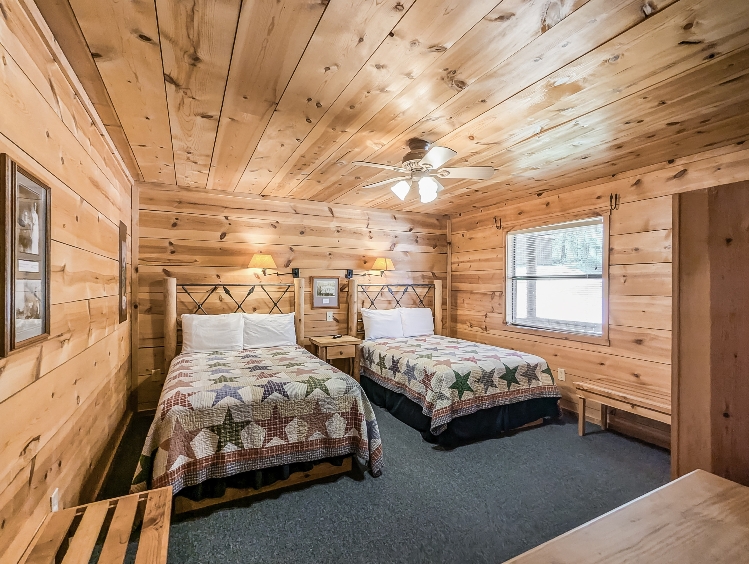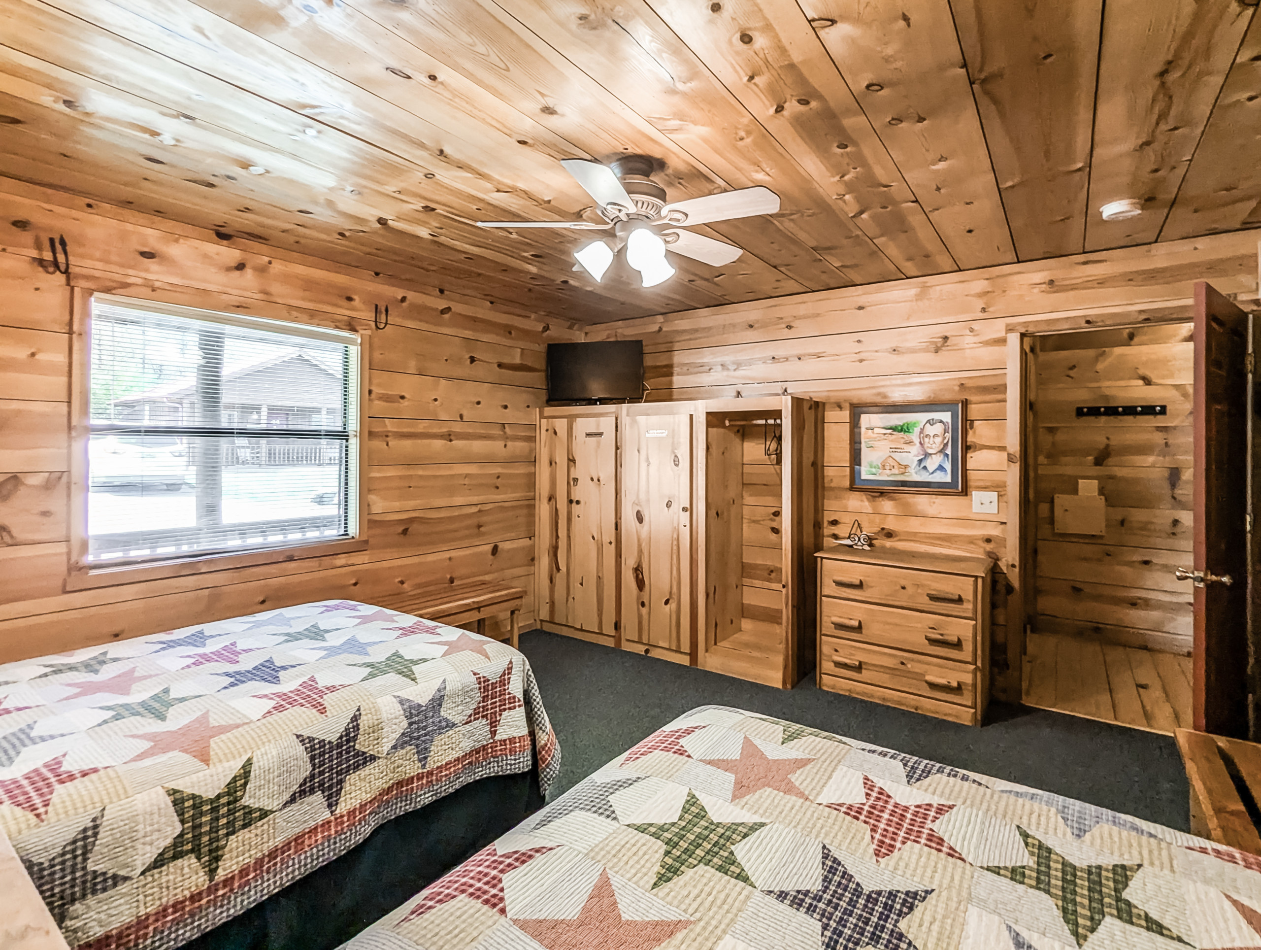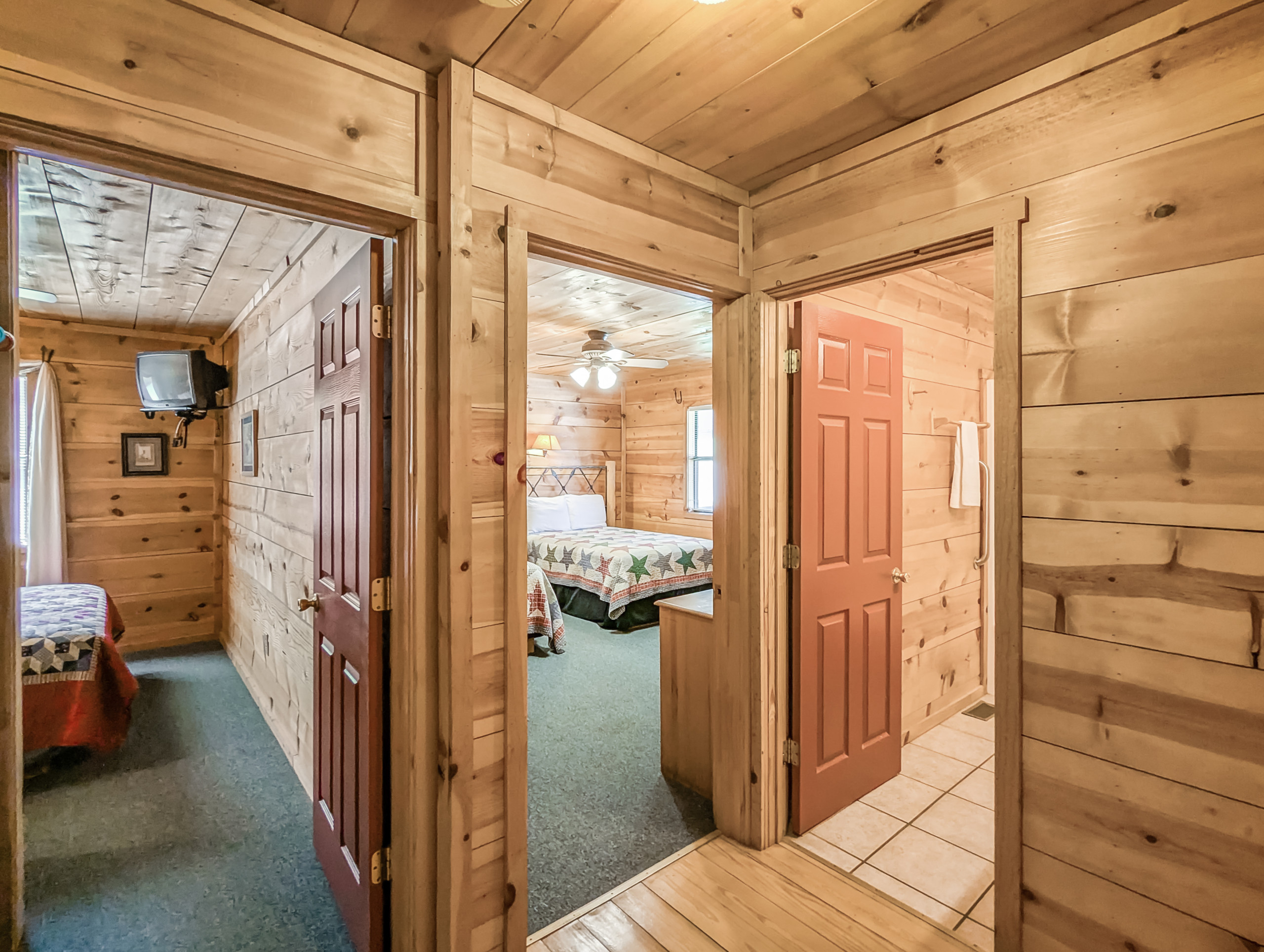This cabin sleeps up to 6 with one bedroom featuring a queen-sized bed and a second bedroom with two full beds. There’s one private bathroom , and one shared bathroom. It has all the essentials for a laid-back stay. It’s paved all the way for easy access, with flat parking and just a five minute walk to the square. Whether you’re planning a nostalgic family trip, a friends' weekend, or booking multiple cabins for your group (privacy meets proximity!), this cabin is perfect for all.