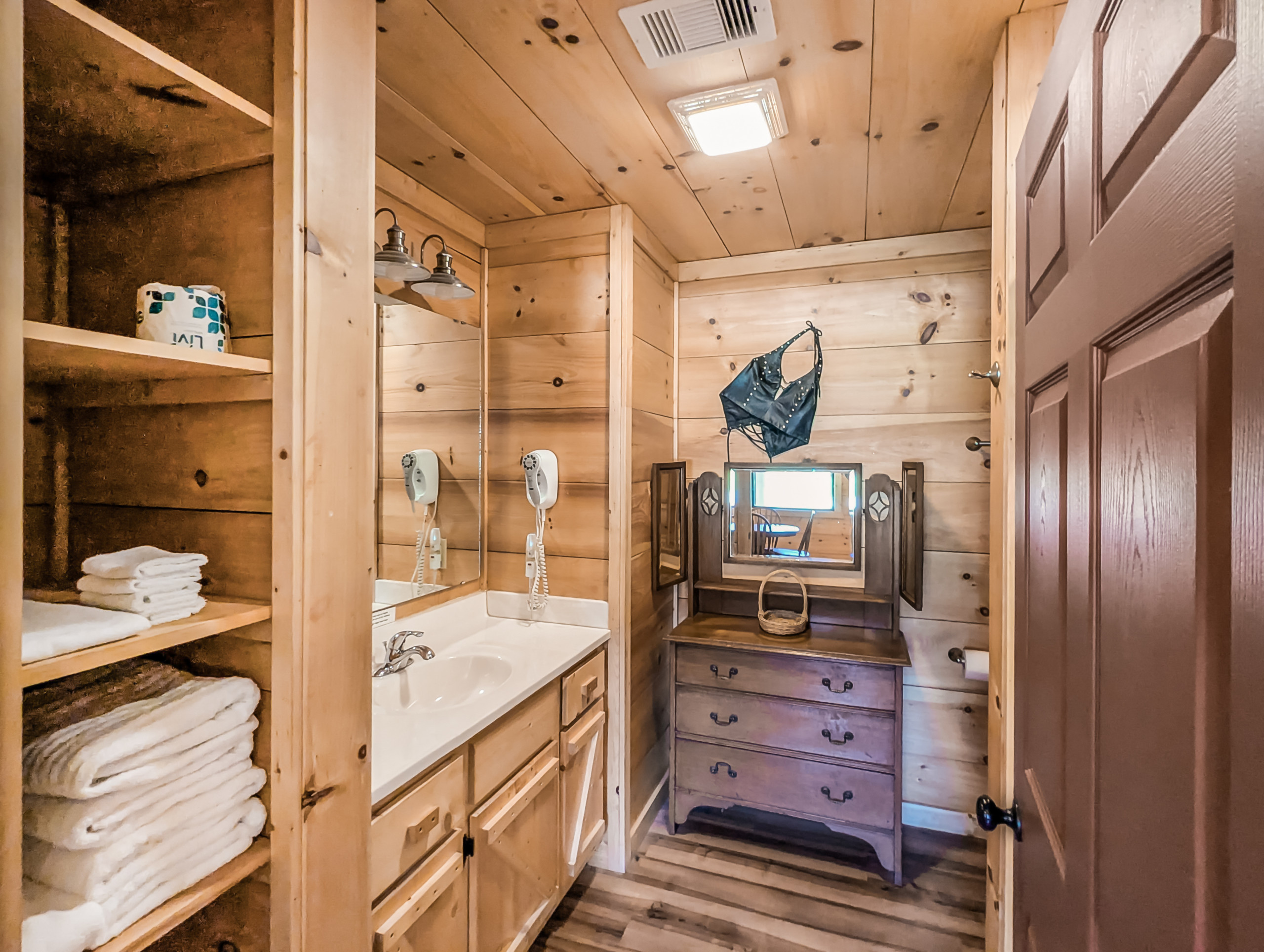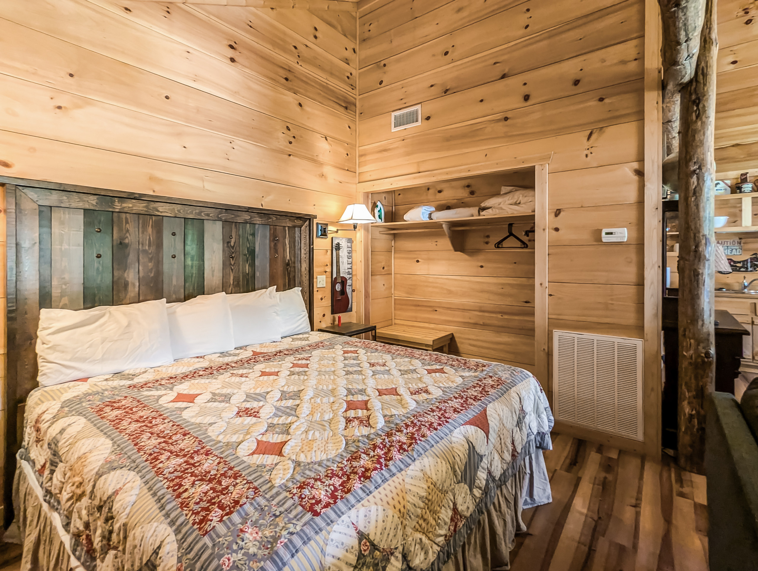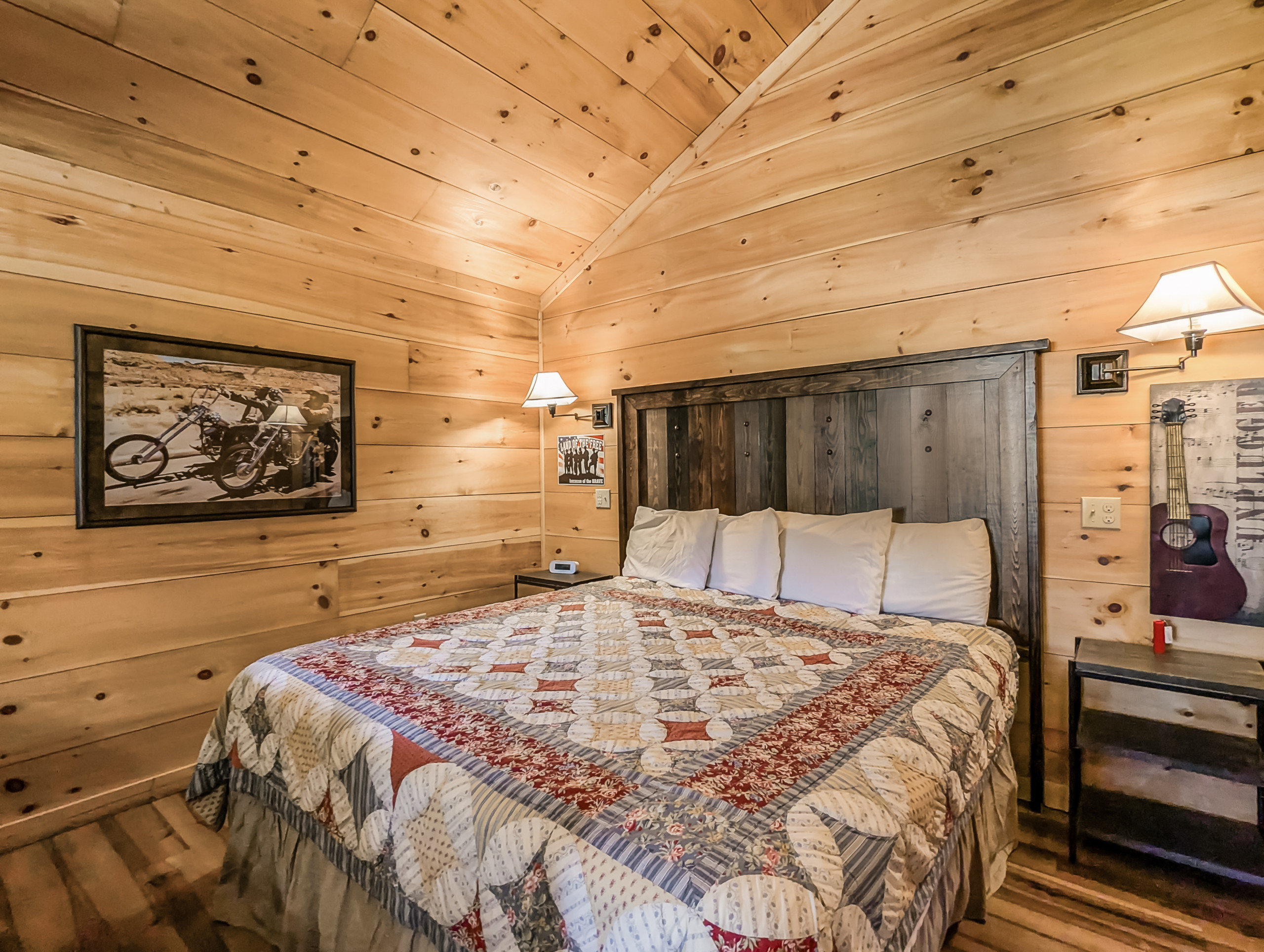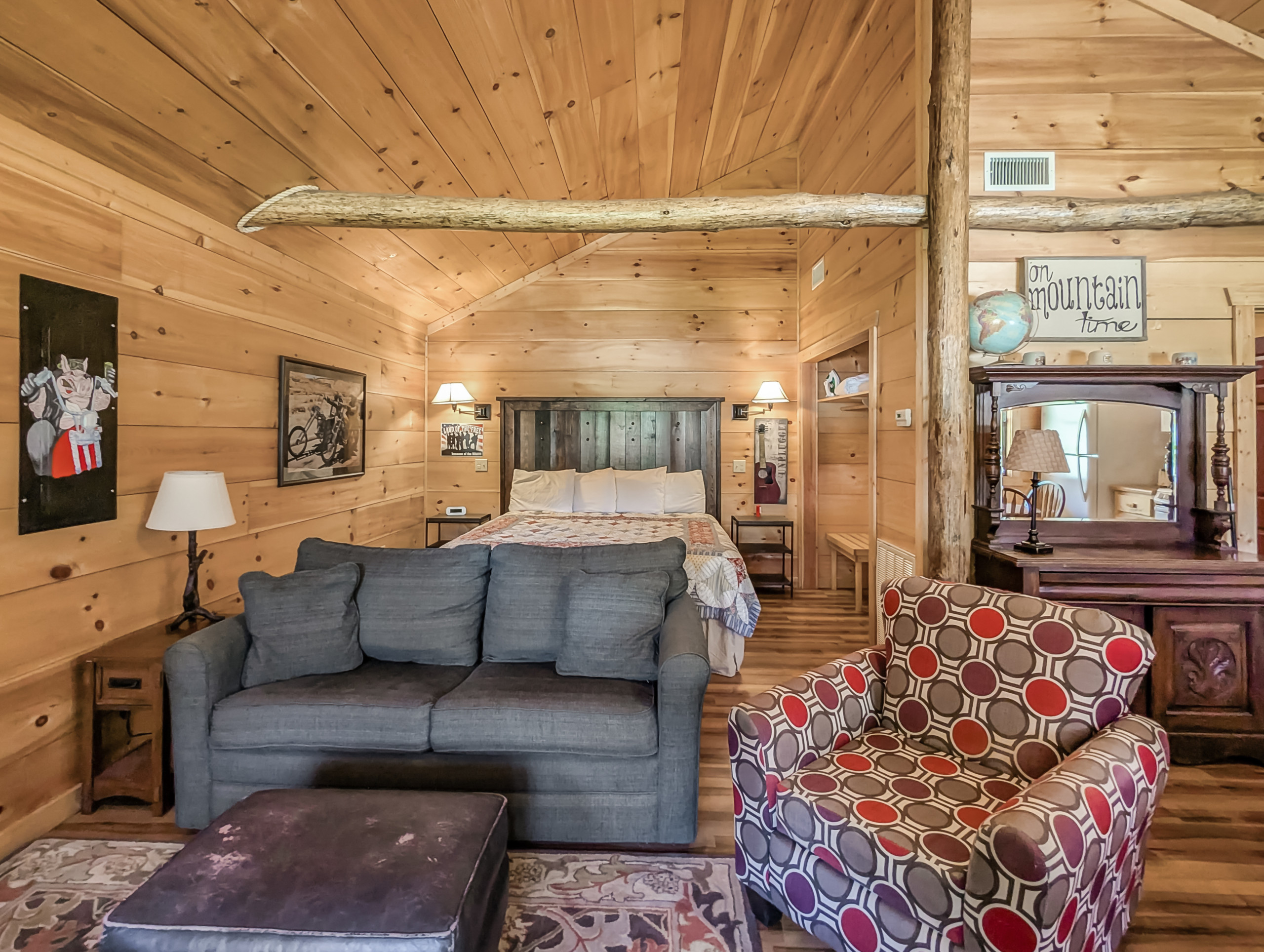 This open floor plan cabin sleeps up to four with a King-sized bed and the living room sofa expands to a double sofa-bed. There is a private bathroom with a shower, gas fireplace, and blazing-fast rural Wi-Fi. It’s paved all the way for easy access, with flat parking and just five walkable minutes to the square. Whether you’re planning a romantic weekend, solo retreat, or want to bring friends and book multiple cabins for your group (hello, privacy!), Hog Holler is easy in, easy out, and easy to love.