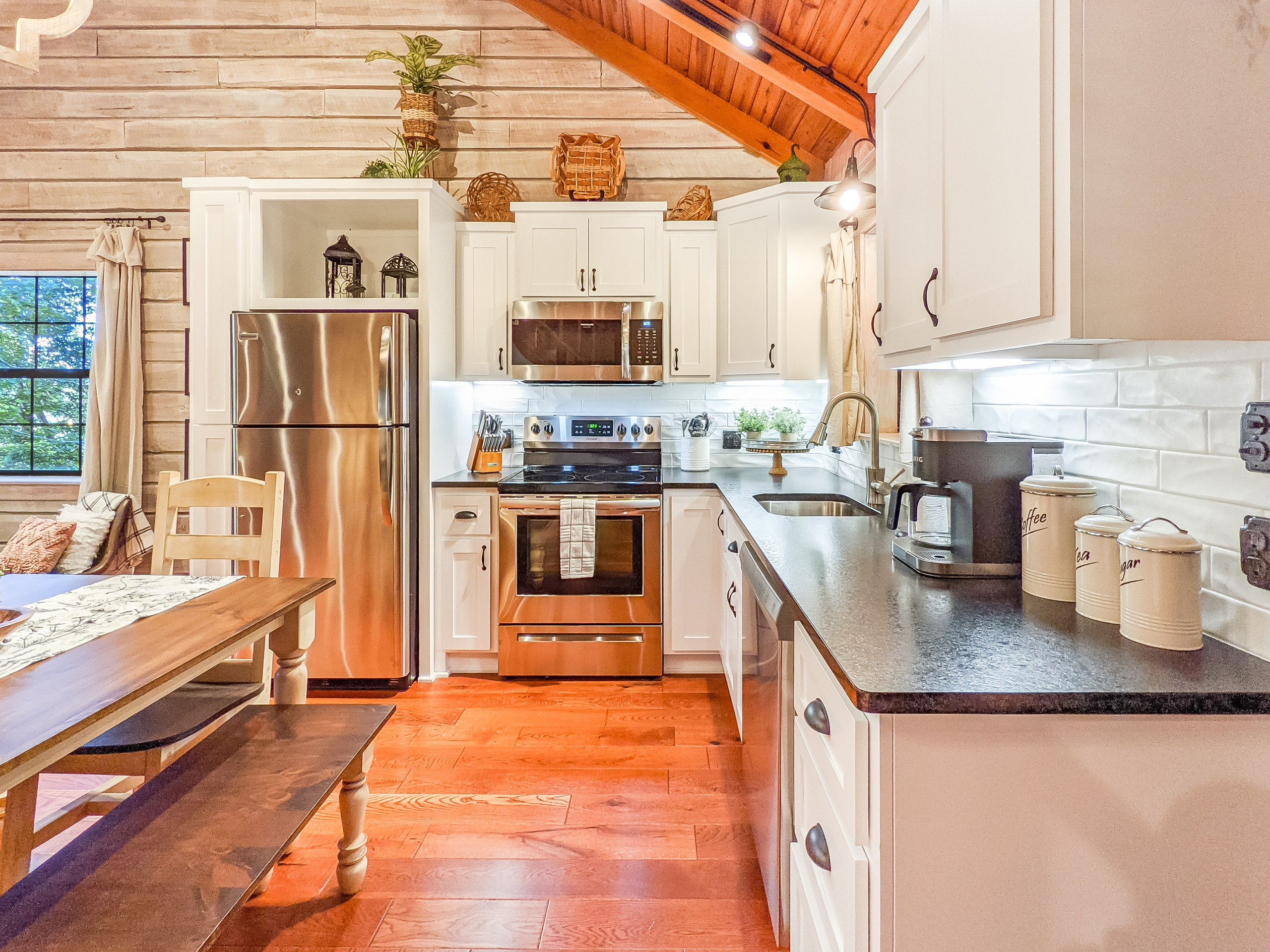 ~ NEWLY renovated kitchen with full size appliances, drip coffee maker + keurig, microwave, cookware, dishes, and cooking utensils