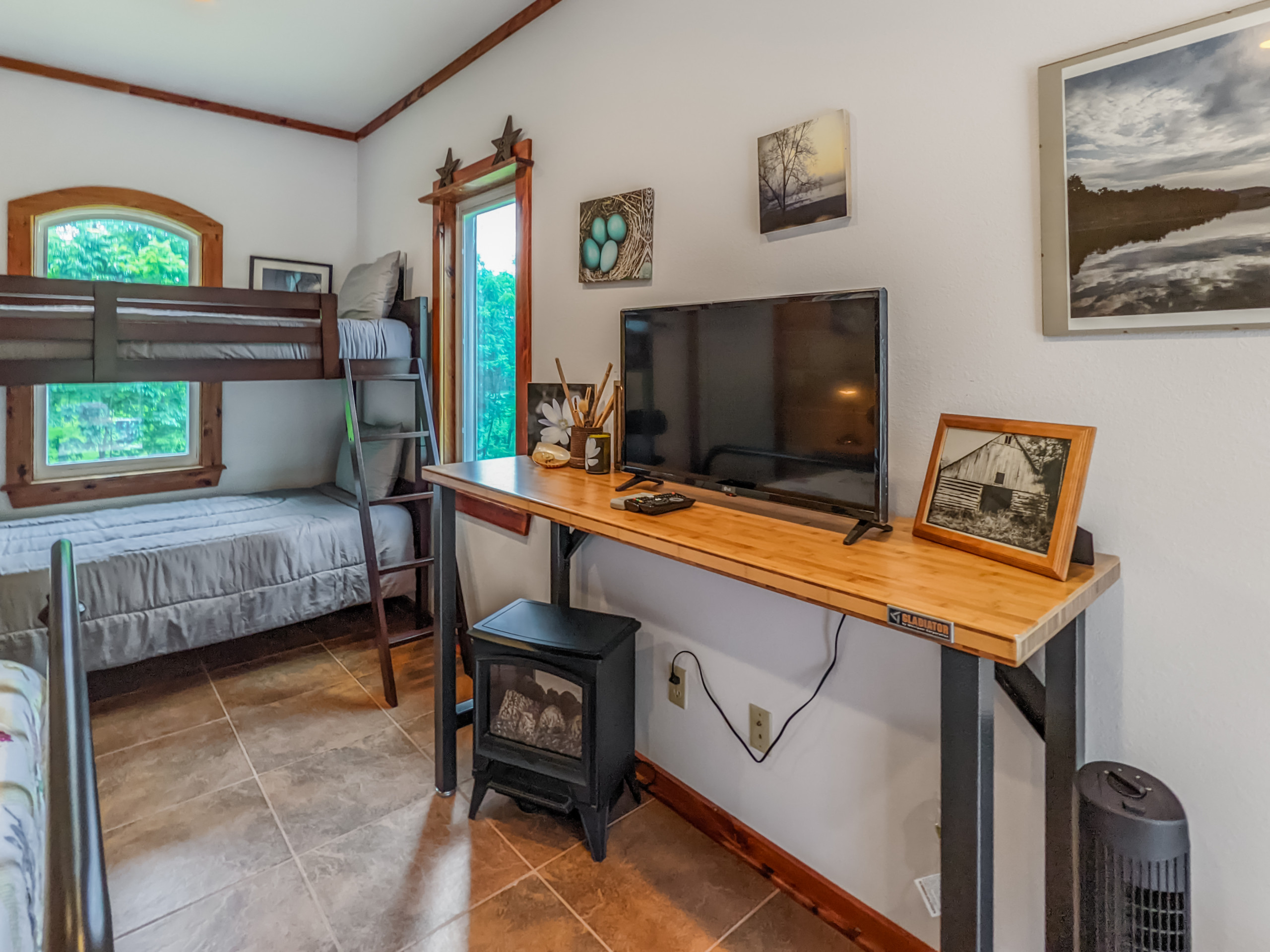 ~ BUNKIE: one queen, 2 bunks (twins), TV, and interior steps into the game/wetbar area on ground level. No bathroom.