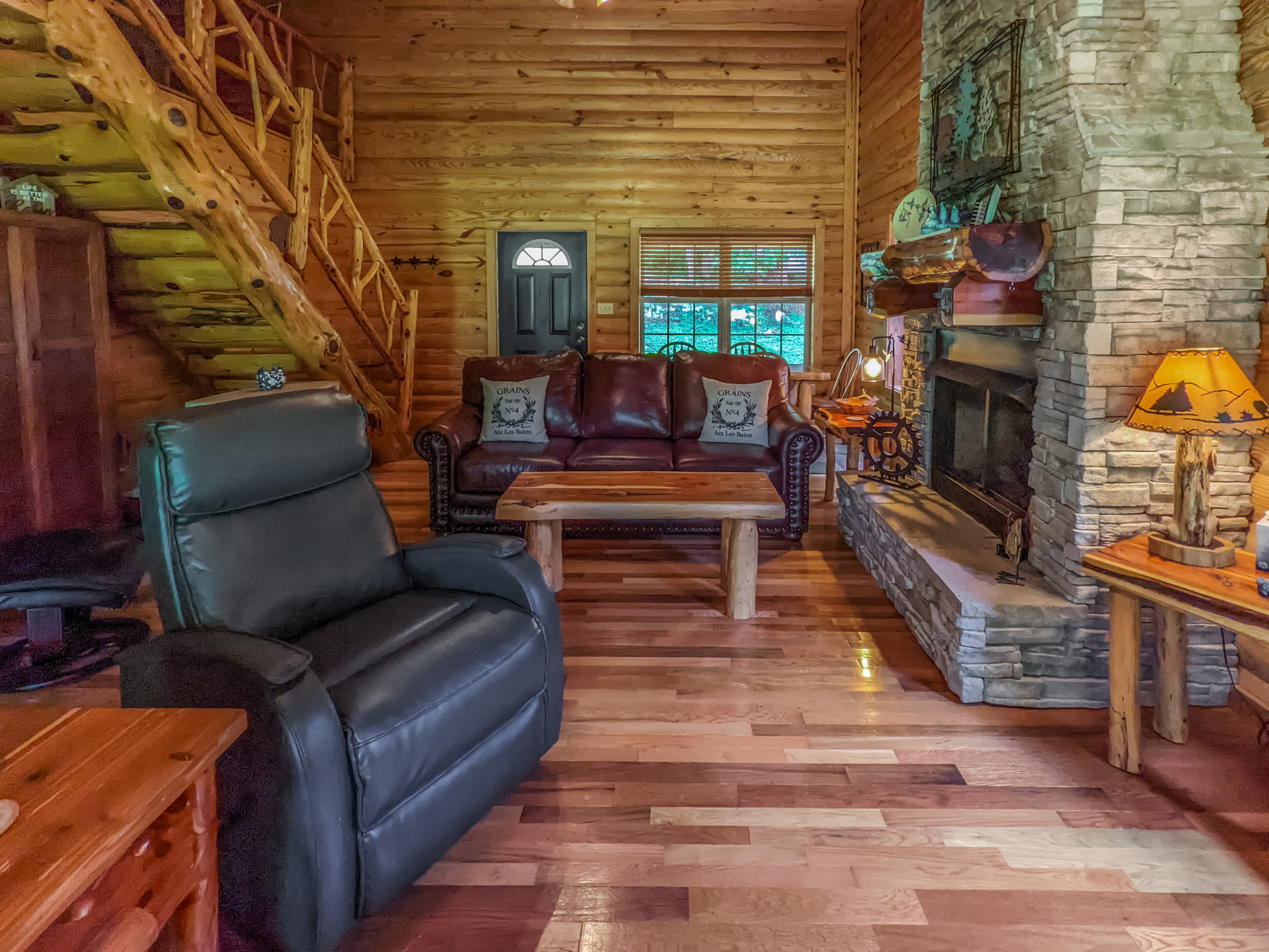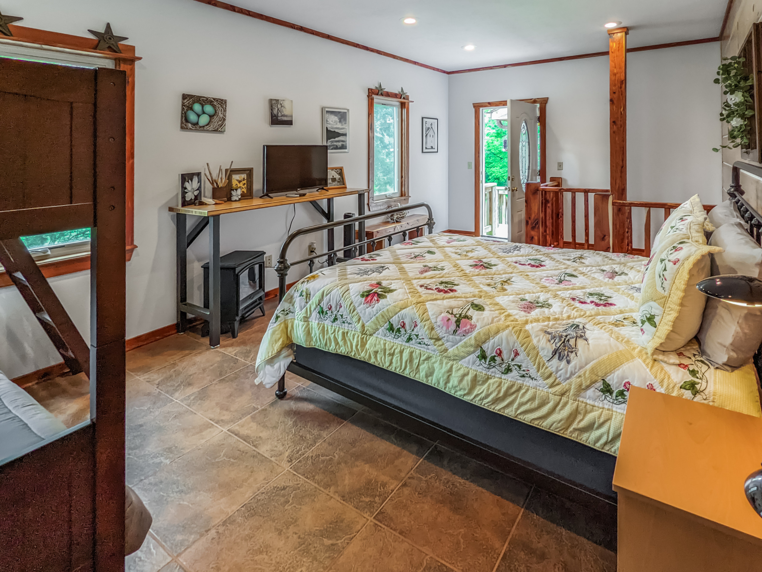 ~MAIN LEVEL: great room with TV and gas fireplace, kitchen, master bedroom with King bed, full bath with shower stall, access to porch and bunkhouse