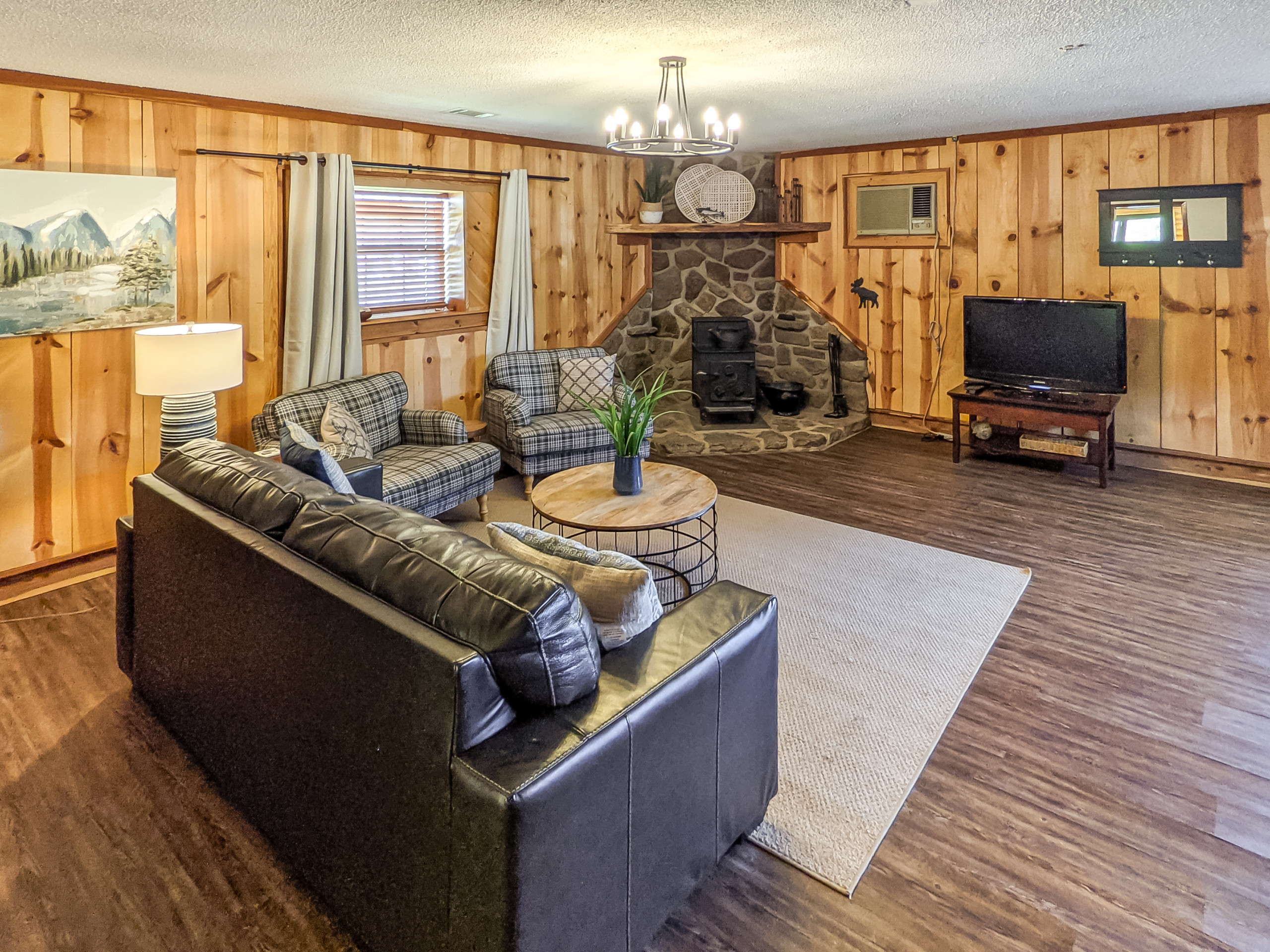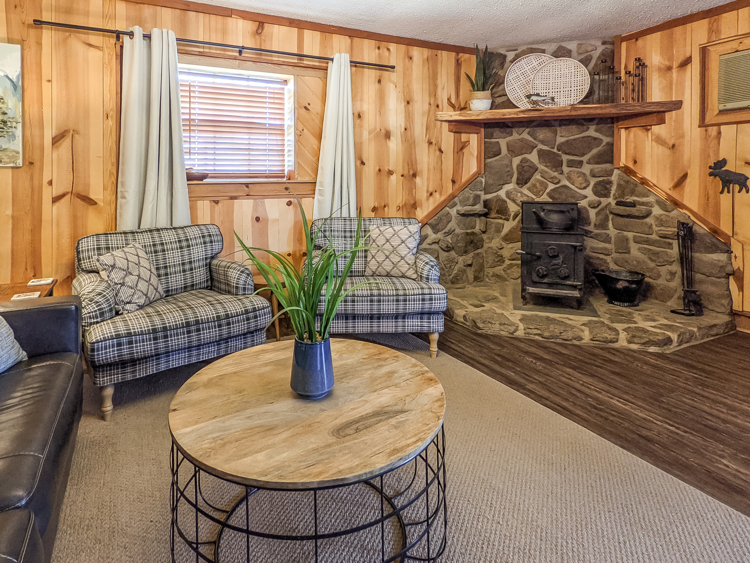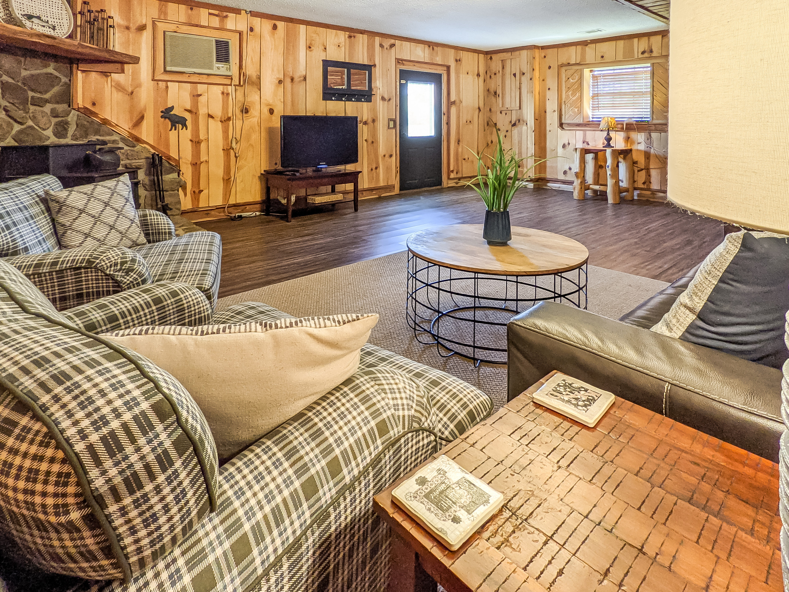 Has an old school authentic fishing cabin feel. There are two wood-burning stoves and a comfy queen Murphy bed in the main living area. The kitchen is smaller but has everything you need to cook most meals. Large lawn gently slopes down to the river’s edge where if the levels are right, you can cast your line there or even pull out your kayak. Rent our next-door sister cabin "The Upper Deck", to expand your group size and experience. You have a paved road all the way in . There is a bonfire pit in the field in front of the river. River View Drive is a neighborhood with full time and part time residents. Cabin is not remote.