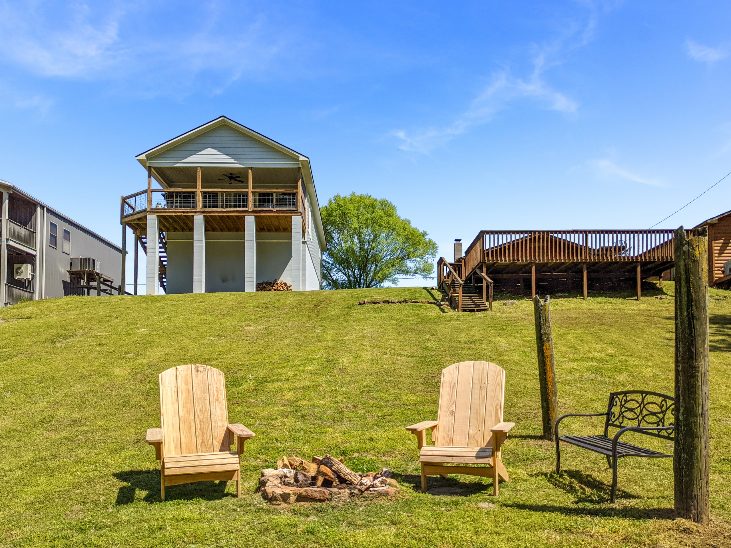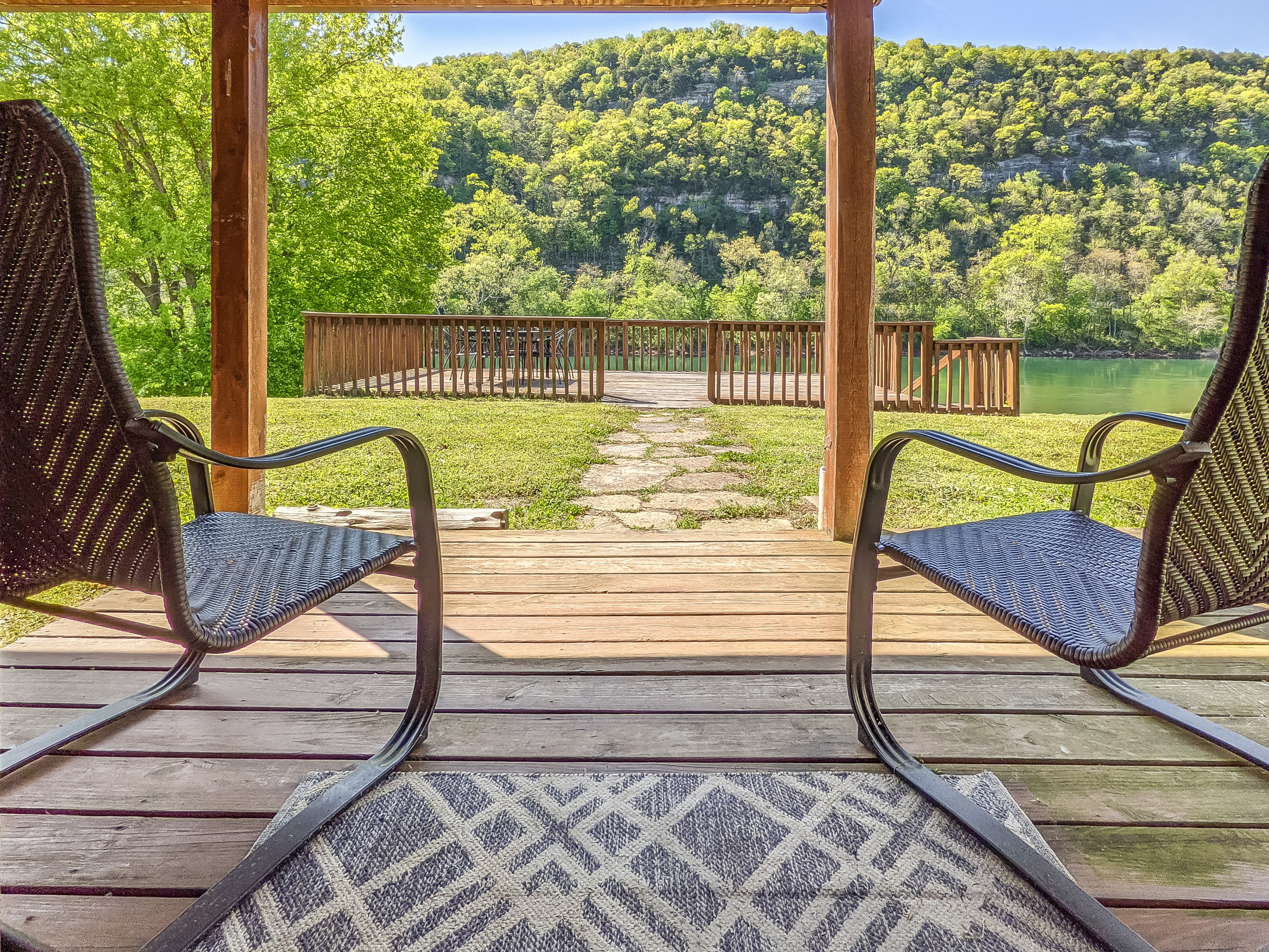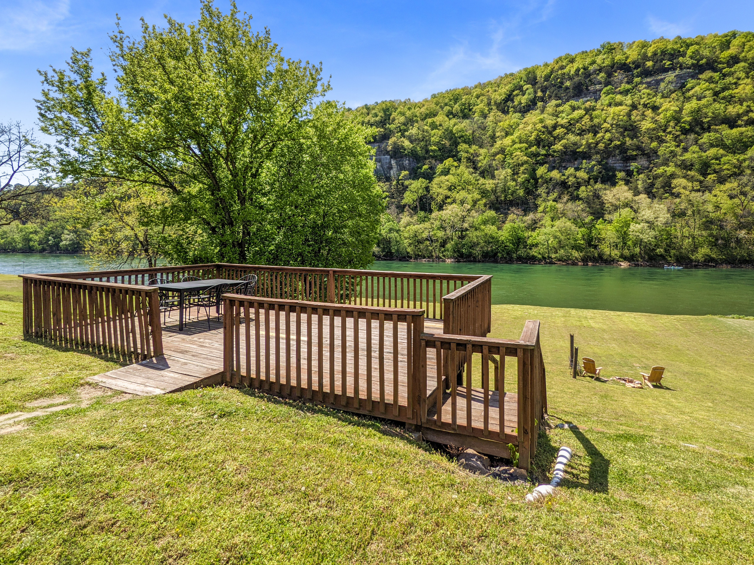The lower deck is adorable. We had a great time with our small dog. She had plenty of space to run and play fetch. There is a beautiful view of the mountains and river. The cabin is cute, clean and perfectly decorated. The fire pit pictured is shared with the upper deck next door, just FYI. All in all, we loved our stay and would definitely go back.