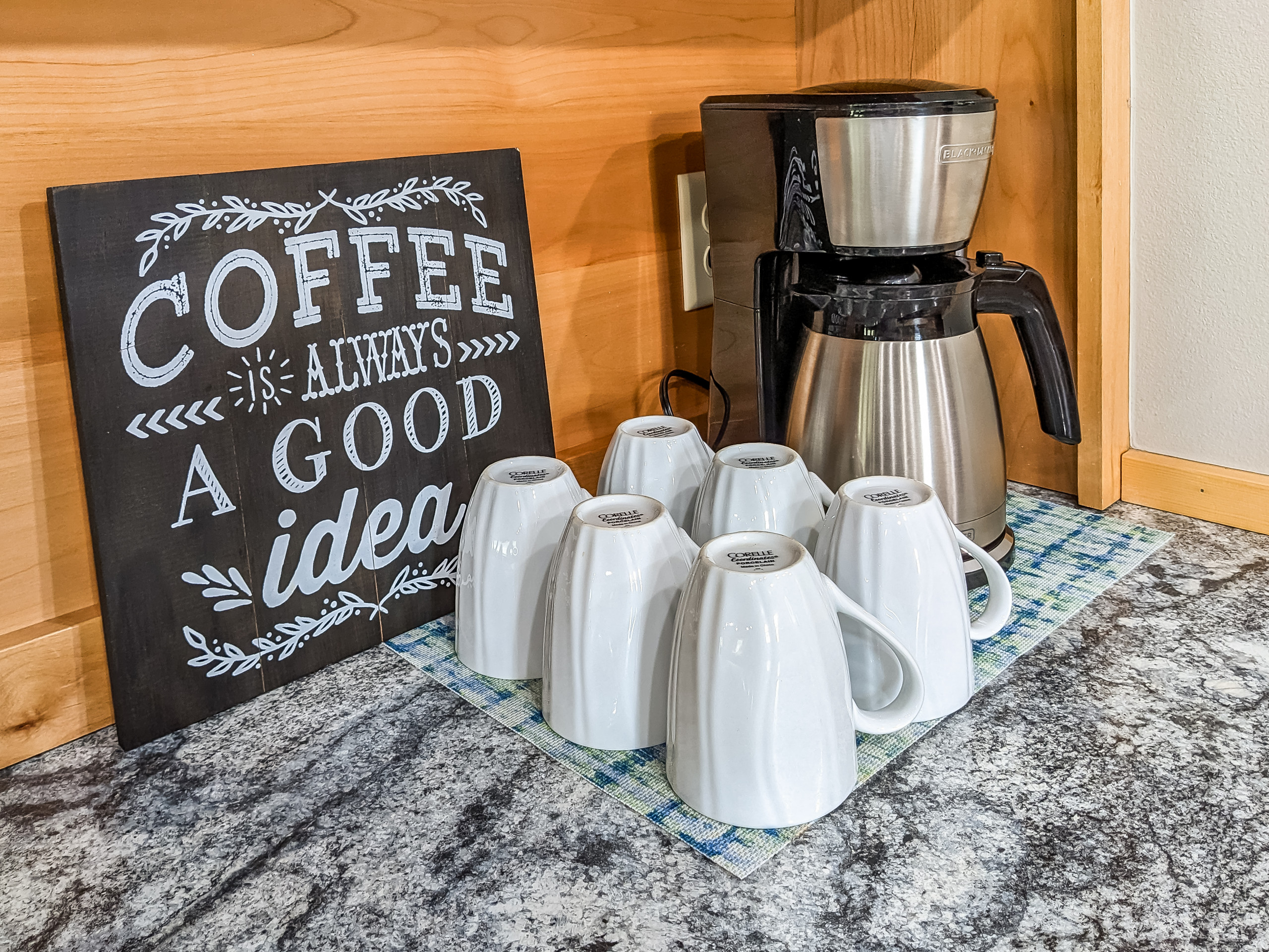 ~ Starter supplies (1 or 2 days depending on personal usage): paper towels, ground coffee + filters, sugar, laundry pods, dishwasher pods, salt + pepper, and cooking oil.